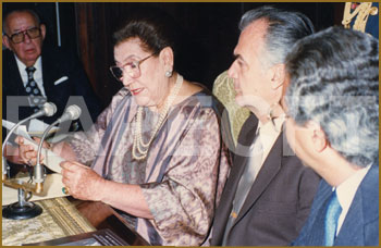 Ceremonia de donación de los archivos a la Nación Mexicana, octubre 20 de 1986. Federico Barrera Fuentes, Hortensia Elías Calles de Torreblanca, Miguel de la Madrid, presidente de México y Francisco Rojas, secretario de la Contraloría.